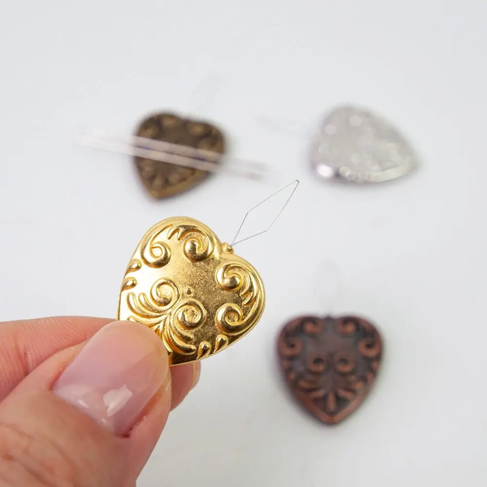 Small but mighty, it measures about 3.5 cm by 2 cm with a thickness of around 0.4 cm, so it fits neatly on your work surface or in a project bag. The cushion is made from durable metal with a refined finish, shown in gold tone here but available in other finishes as shown in the selection photos. The classic heart shape and elegant scrolling pattern add a touch of charm to your crafting space while you work.